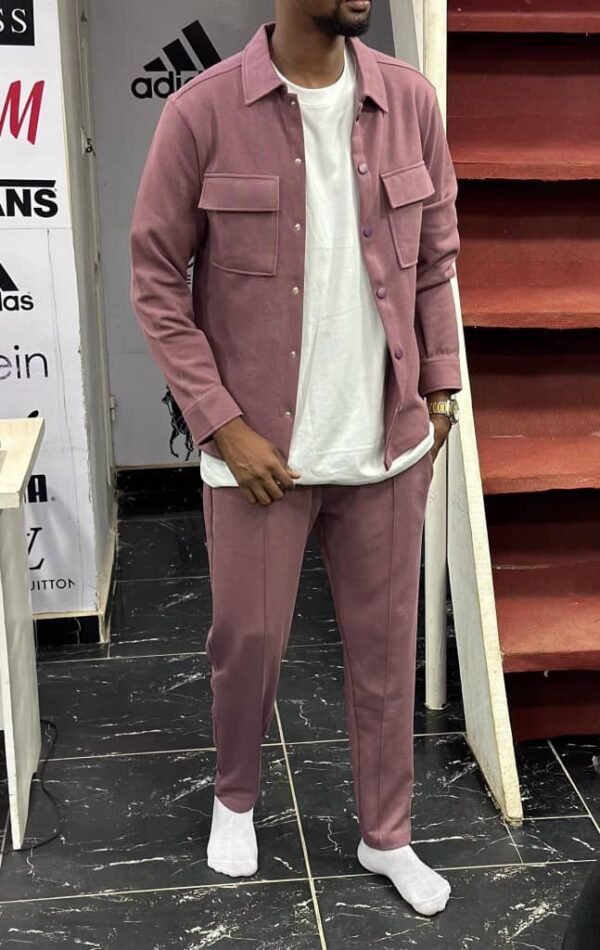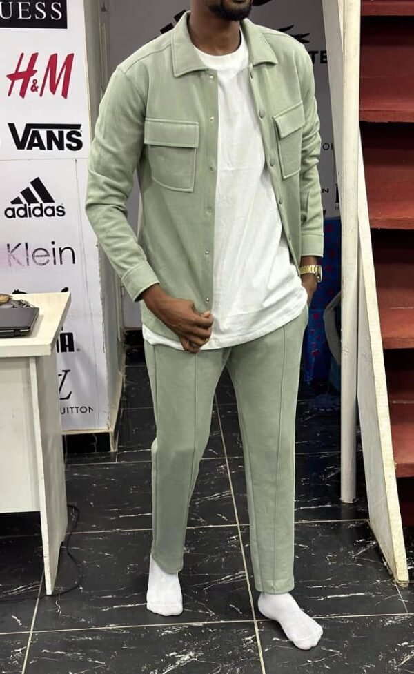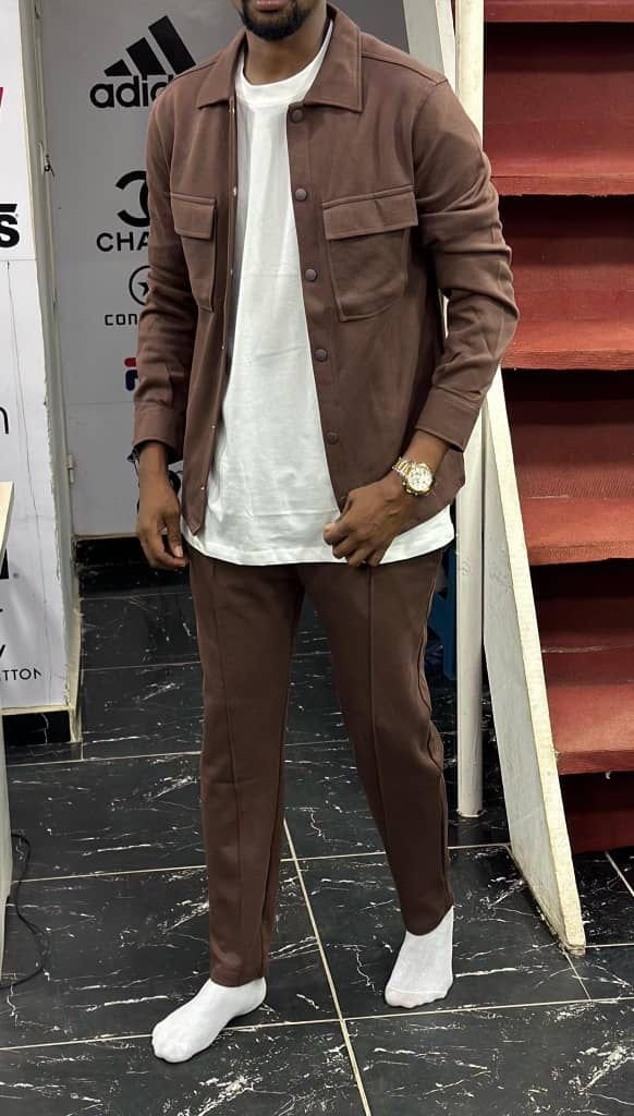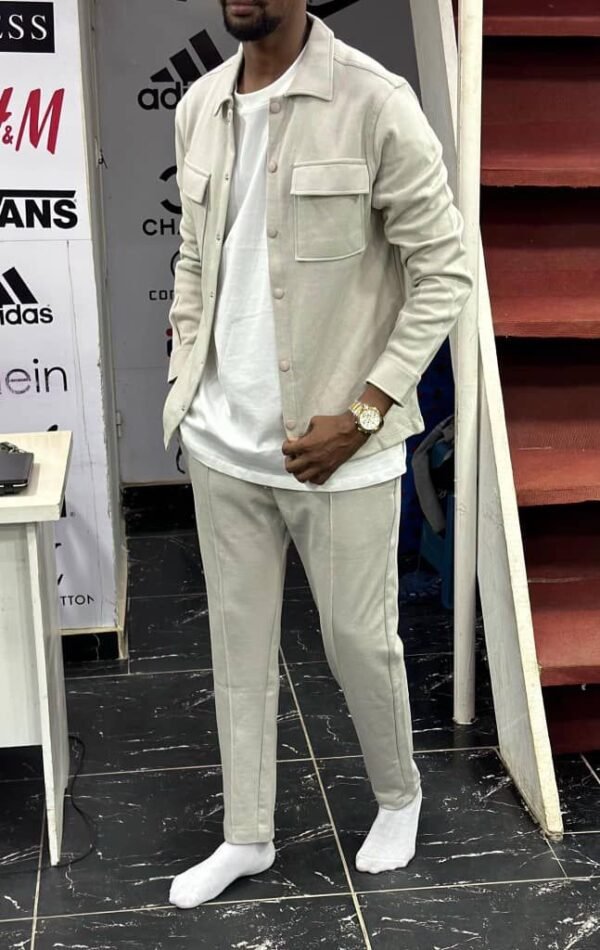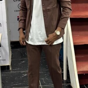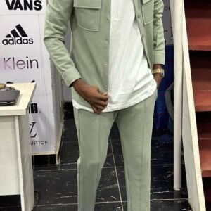 Le pantalon assorti, également fabriqué en coton, complète l’ensemble avec élégance. Sa coupe peut varier entre droite et ajustée, offrant un équilibre entre confort et esthétique. Les détails tels que les poches fonctionnelles, la braguette et la ceinture ajoutent une touche de sophistication.